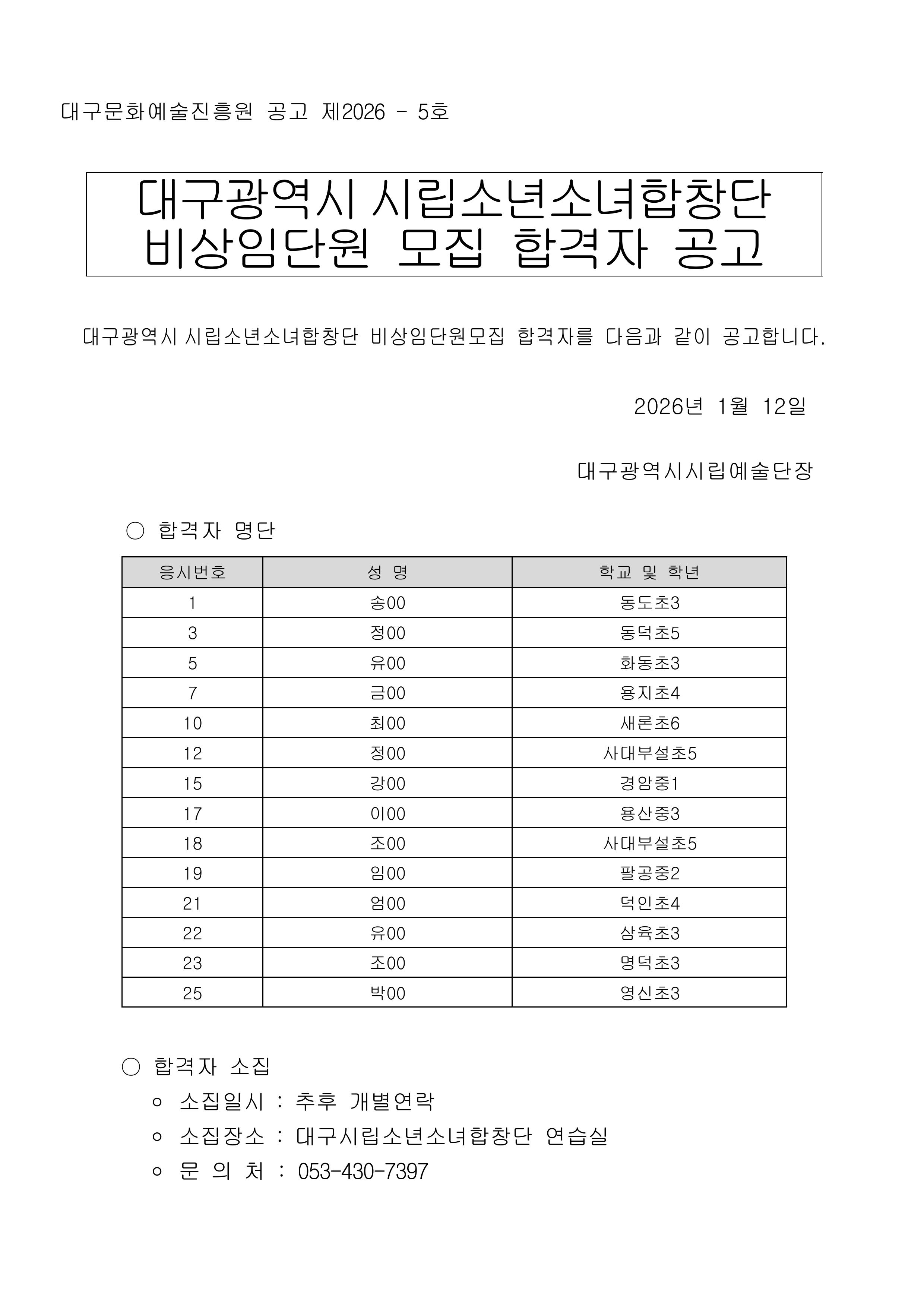 58090| 제목 | 2026 대구시립소년소녀합창단 상반기 비상임단원 모집 합격자 공고 | ||