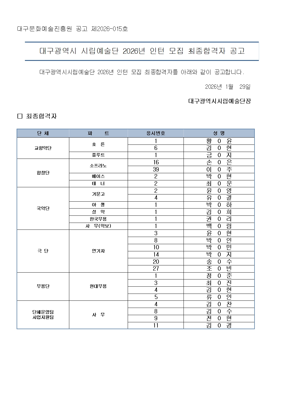 58103| 제목 | 2026년 대구시립예술단 인턴모집 최종 합격자 발표 | ||